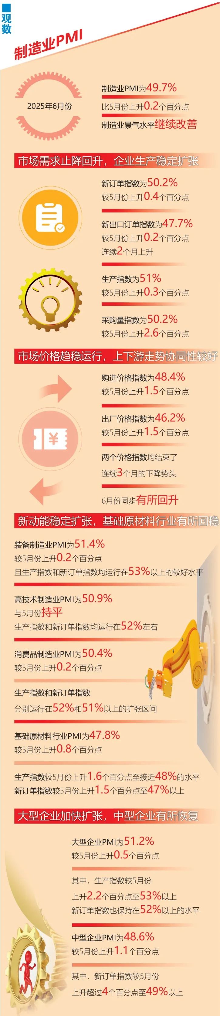 值得一提的是,新动能成为制造业复苏的关键引擎。数据显示,6月份,装备制造业PMI达到51.4%,生产指数与新订单指数均位于53%以上;高技术制造业PMI稳定在50.9%,核心指数维持在52%左右。消费品制造业PMI同步扩张,基础原材料行业PMI回升0.8个百分点至47.8%,生产指数提升1.6个百分点至接近48%,产业链上游的止跌回稳为下游提供支撑。企业规模分化中见优化,大型企业PMI加速扩张至51.2%,生产指数跃升2.2个百分点至53%以上;中型企业新订单指数大幅上升超4个百分点至49%以上。
