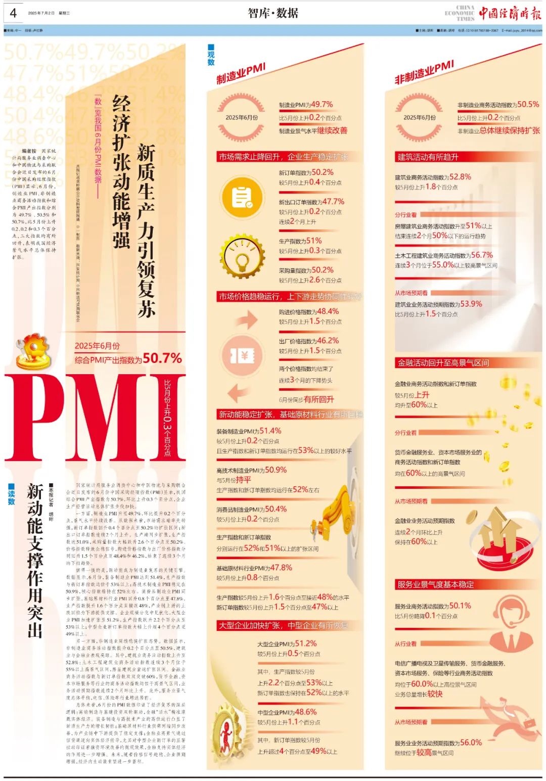 编者按国家统计局服务业调查中心和中国物流与采购联合会近日发布的6月份中国采购经理指数(PMI)显示,6月份,制造业PMI、非制造业商务活动指数和综合PMI产出指数分别为49.7%、50.5%和50.7%,比5月份上升0.2、0.2和0.3个百分点,三大指数均有所回升,表明我国经济景气水平总体保持扩张。