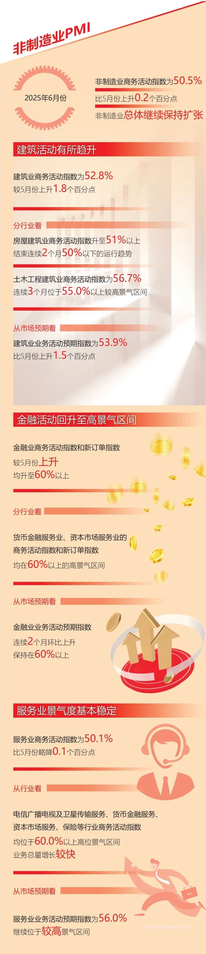 另一方面,非制造业延续稳健扩张态势。数据显示,非制造业商务活动指数提升0.2个百分点至50.5%,建筑业与金融业表现亮眼。其中,建筑业商务活动指数上升至52.8%:土木工程建筑业商务活动指数连续3个月位于55%以上高景气区间,房屋建筑业重返扩张区间。金融业商务活动指数与新订单指数双双突破60%,货币金融、资本市场服务等行业的商务活动指数均位于高景气区间,业务活动预期指数连续2个月环比上升。此外,服务业景气度总体平稳,电信、保险等行业增速居前。