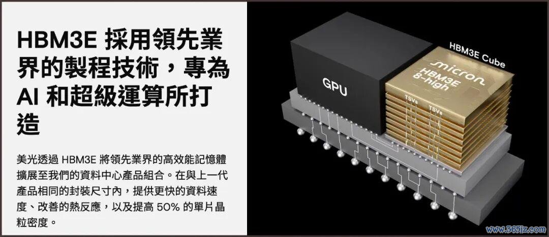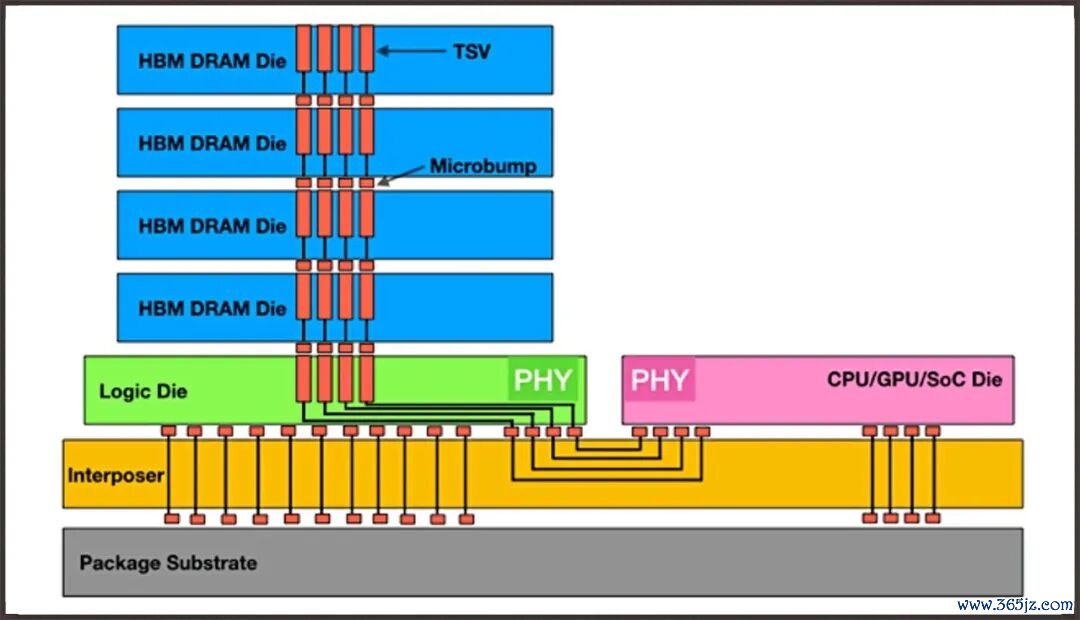 简单来说,它把不同的芯片高密度堆叠在一起,中间穿一堆孔,然后连接起来。类似在GPU旁边建一栋宿舍大楼,可以消耗更少的功率来获得更大的带宽。