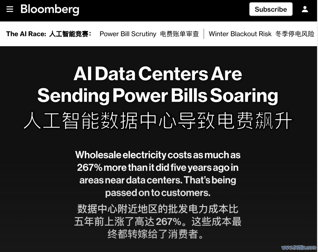 彭博社做过统计,AI数据中心密集区域附近,单月电价比起五年前上涨了高达267%,远超全美平均水平。