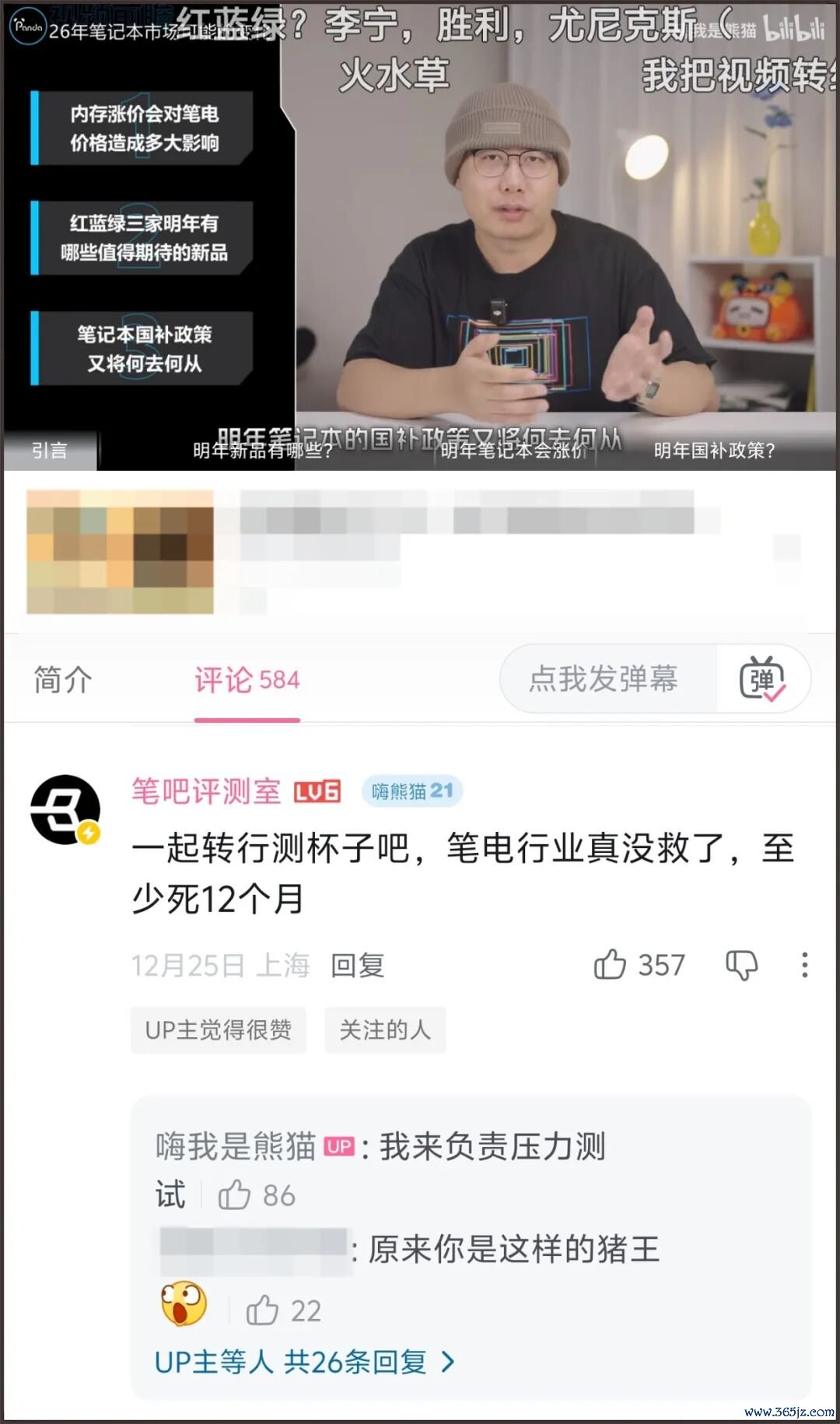 笑死,之前看B站笔电评测的「熊猫」对2026年市场的前瞻视频。底下评论区「笔吧评测室」的猪王还在调侃,要转行去测杯子了,可见这行业有多难做。