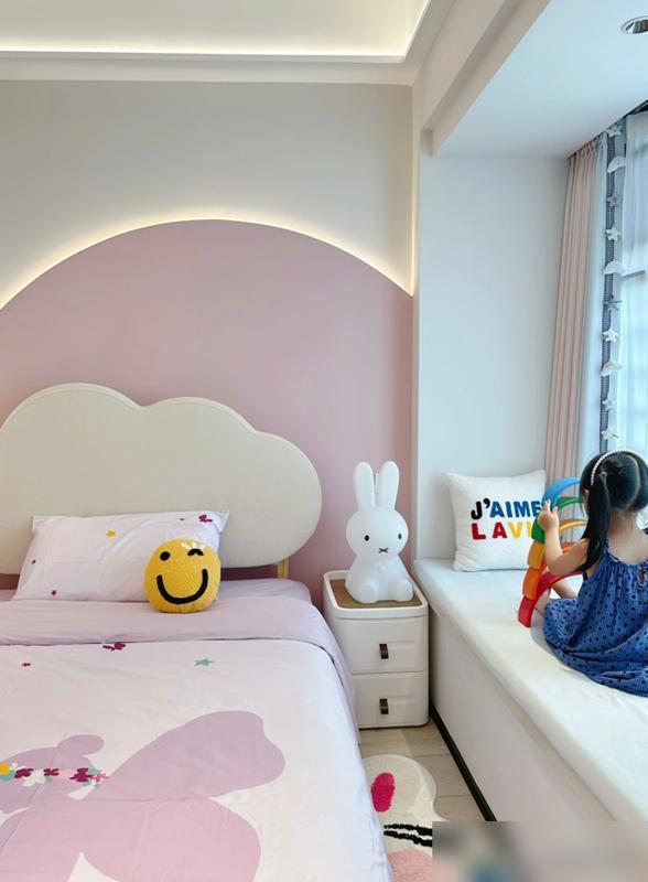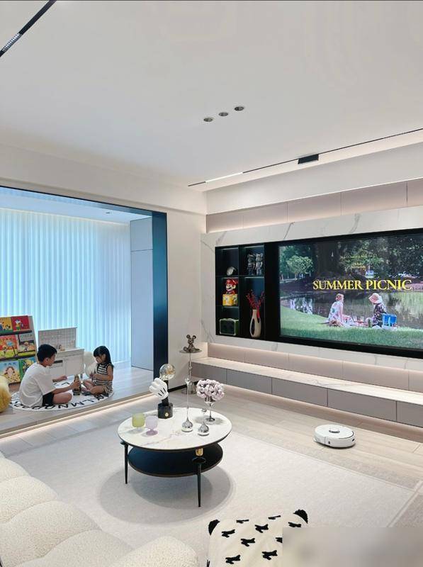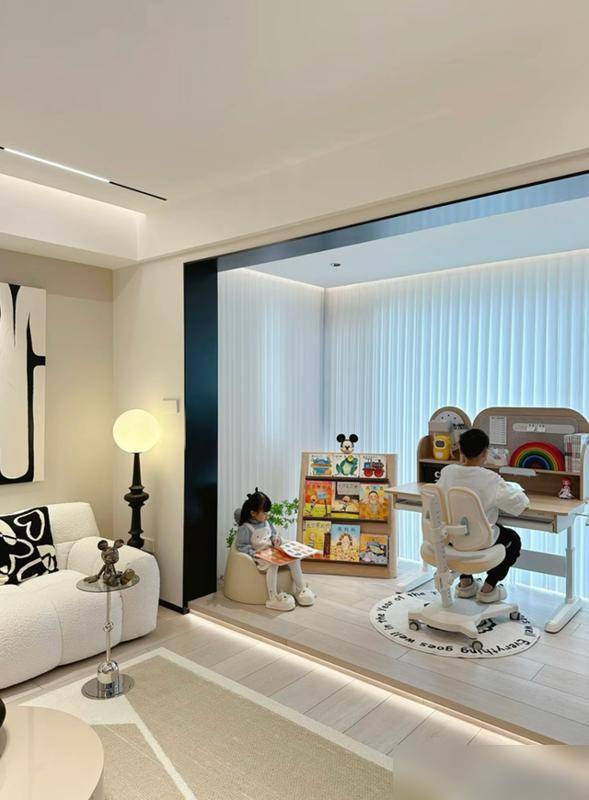 客厅更绝,阳台打通做成抬高地台,孩子在上面打滚看书,比花大几千买的爬爬垫还实在。
