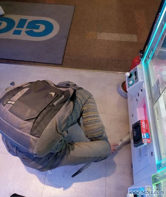 配图中,有人正蹲在街机机台下方,极其熟练地搜寻着玩家遗落的硬币。
