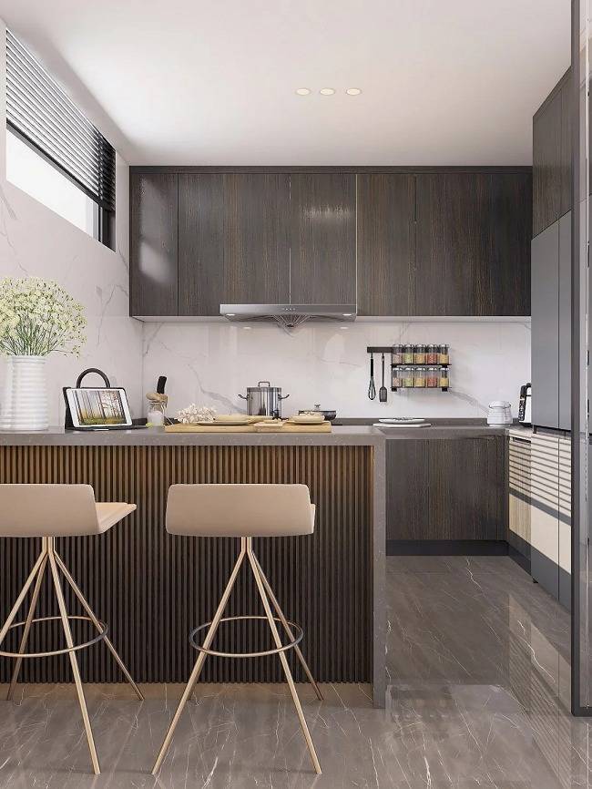 现代简约风格采用深色柜门搭配浅色墙面,不仅不显得压抑,反而营造出温馨、柔和的氛围。深色柜门不仅耐脏、耐看,还自带高级感,视觉质感立刻拉满,让厨房瞬间提升多个档次。
