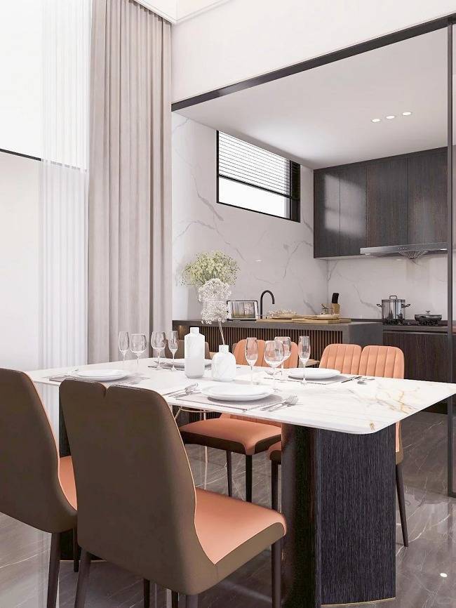 从洗菜区、水槽区到操作台、烹饪区,整个厨房的动线科学流畅,做饭过程无需来回奔波,既节省体力,也更安全。左侧岛台设计则兼顾了功能与生活场景,搭配高脚椅可作为早餐台,也可成为亲友小聚的交流角。一边做饭,一边聊天,其乐融融,生活感十足。