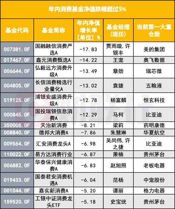 而在业绩垫底的队列中,国融融信消费严选年内累计净值跌幅达17.83%。从其一季度重仓股结构看,该基金依然以传统消费标的为主,包括伊利股份、贵州茅台、五粮液等。跌幅第二的鑫元消费甄选(-14.22%)重仓股则情况不同,一季度重仓奥飞数据、大位科技、天马科技等科技股。