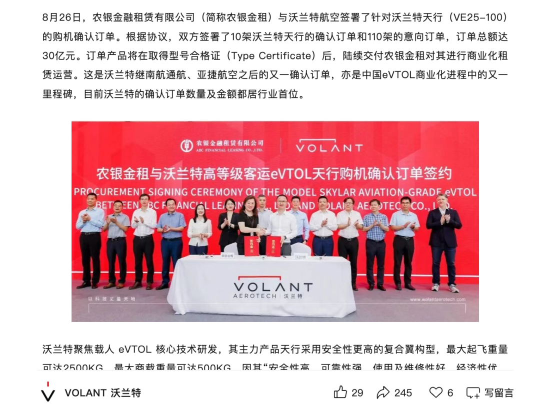 8月26日,上海沃兰特航空技术有限责任公司(以下简称“沃兰特航空”)与农银金融租赁有限公司(以下简称“农银金租”)达成重要合作,正式签署沃兰特天行(VE25-100)机型的购机确认订单。根据协议内容,农银金租将向沃兰特航空采购10架天行机型(确认订单),同时双方还签订了110架天行机型的意向订单,此次订单总额累计达30亿元。