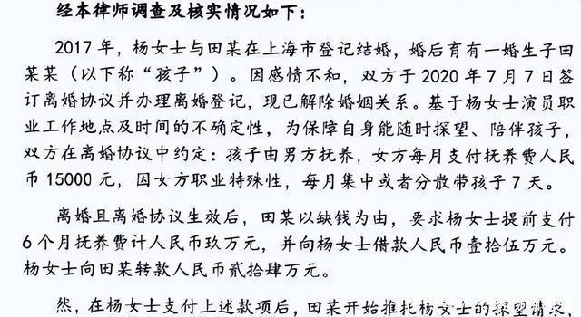 离婚后的杨明娜,日子过得一点也不轻松。田亮拿了抚养权还不消停,不但限制她探望儿子,还变着法儿找她要钱。他先是说一次性付6个月抚养费9万,后来又“借”了15万,总共24万,杨明娜都给了,就为了能多看看儿子。可田亮得了钱却不守信用,照样不让她见孩子,还在网上继续抹黑她,说她不关心儿子。杨明娜那时候真是又气又无奈,但为了儿子,她只能忍。