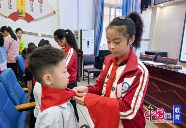 在庄重的时刻,老队员为新队员佩戴上鲜艳的红领巾。当红领巾在胸前飘扬,新队员脸上洋溢着自豪的笑容。该校全体新队员在大队长的指导下学习敬标准队礼,并进行了铿锵有力的呼号:“时刻准备着!”
