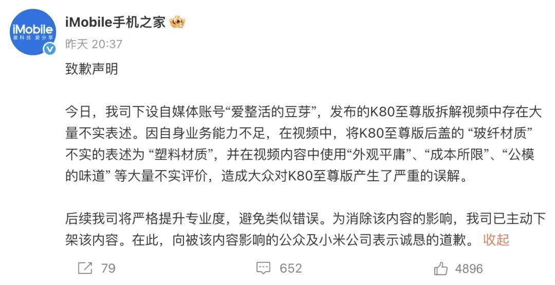 【手机之家向小米公开致歉】6月20日,iMobile手机之家就下设自媒体账号“爱整活的豆芽”对小米K80至尊版拆解视频存在大量不实表述发布致歉声明:我司下设自媒体账号“爱整活的豆芽”,发布的K80至尊版拆解视频中存在大量不实表述。因自身业务能力不足,在视频中,将K80至尊版后盖的“玻纤材质”不实的表述为“塑料材质”,并在视频内容中使用“外观平庸”、“成本所限”、“公模的味道”等大量不实评价,造成大众对K80至尊版产生了严重的误解。后续我司将严格提升专业度,避免类似错误。为消除该内容的影响,我司已主动下架该内容。在此,向被该内容影响的公众及小米公司表示诚恳的道歉。(新浪科技)